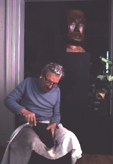 This is a picture of Nat near his sculpture, "Captain," and a Cross.
